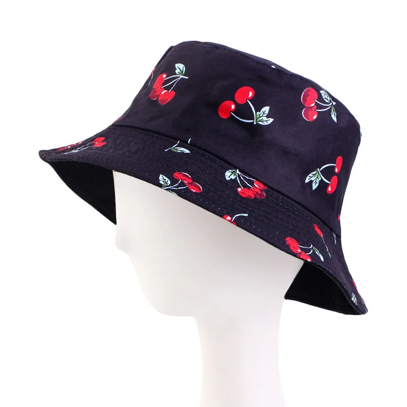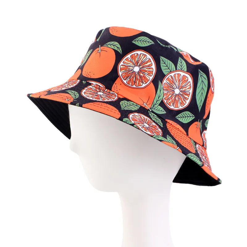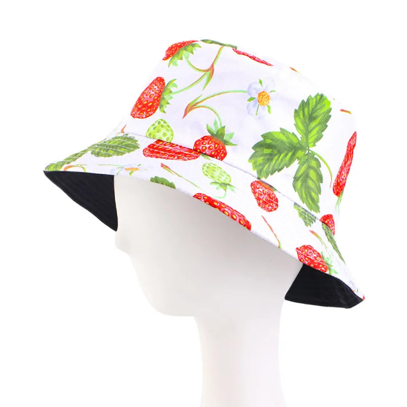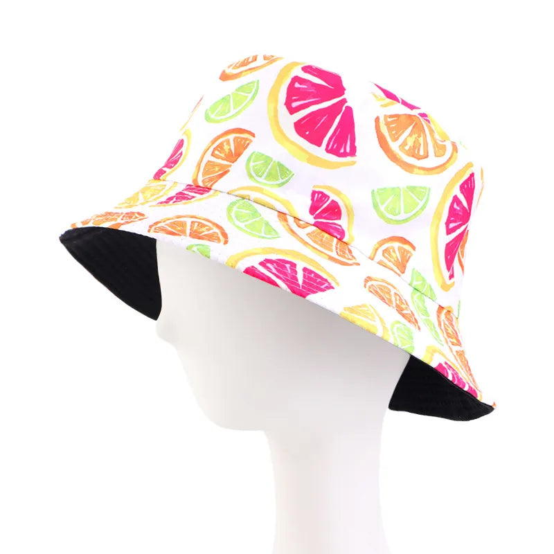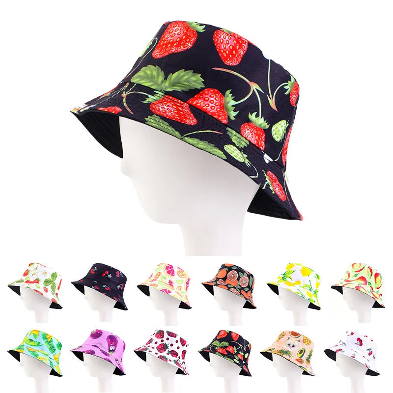 Double-Sided Wearable Summer Fashion Fruit Print Pot Hat Outdoor Travel Sun Hat JDPM-46 Casual Style Women's Sporty Flat Brim Cap